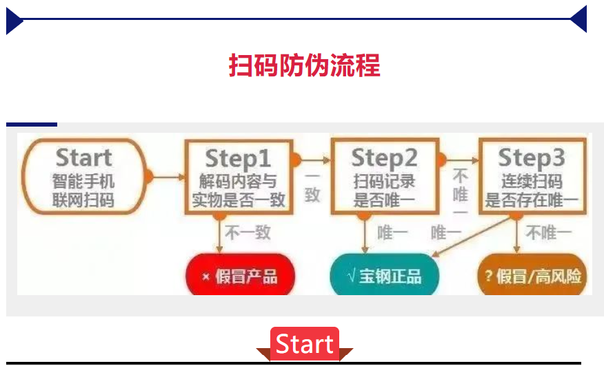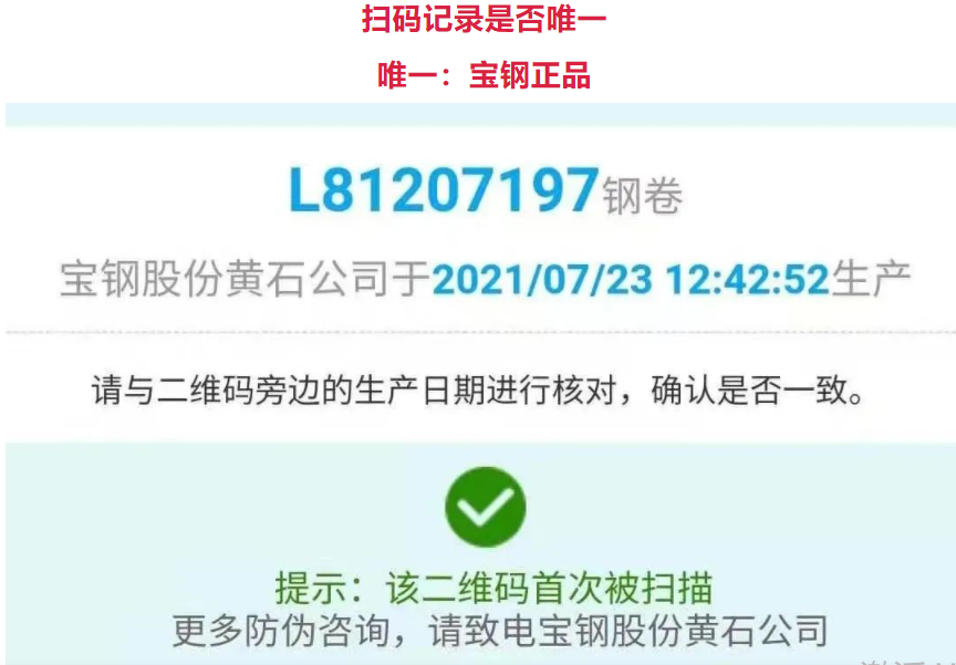 寶鋼股份首創(chuàng)的彩涂防偽二維碼,采用雙碼關(guān)聯(lián)合一技術(shù),根據(jù)卷號、線號、時間、序列等條件生成的唯一加密二維碼,用戶只需要用手機(jī)掃描即可與彩涂卷上明文噴印的卷號、時間比對驗(yàn)證產(chǎn)品真?zhèn)巍M瑫r,寶鋼系統(tǒng)將記錄每一次掃碼的時間和地點(diǎn),并在用戶掃碼時展示該二維碼掃描記錄,從而幫助用戶判別產(chǎn)品真?zhèn)巍?