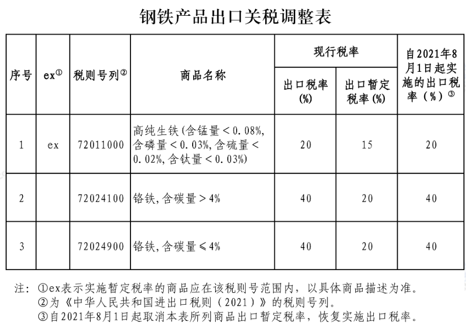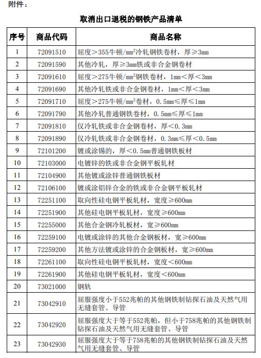 香港萬得通訊社報道,財政部發布《關于取消鋼鐵產品出口退稅的公告》表示,自2021年8月1日起,取消本公告所附清單列示的鋼鐵產品出口退稅。具體執行時間,以出口貨物報關單上注明的出口日期界定。