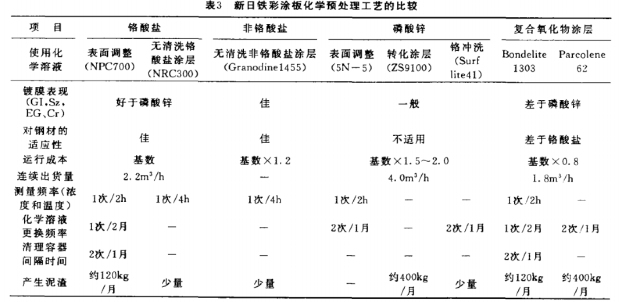 由于有以上這些突出優點,已有取代反應型鉻酸鹽處理的趨勢(見表3)。武鋼彩涂線、寶鋼2“彩涂線、首鋼在建的彩涂線都采用輯涂鉻酸鹽處理技術。