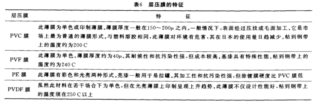 貼膜彩涂板所用層壓膜使用特點見表6。