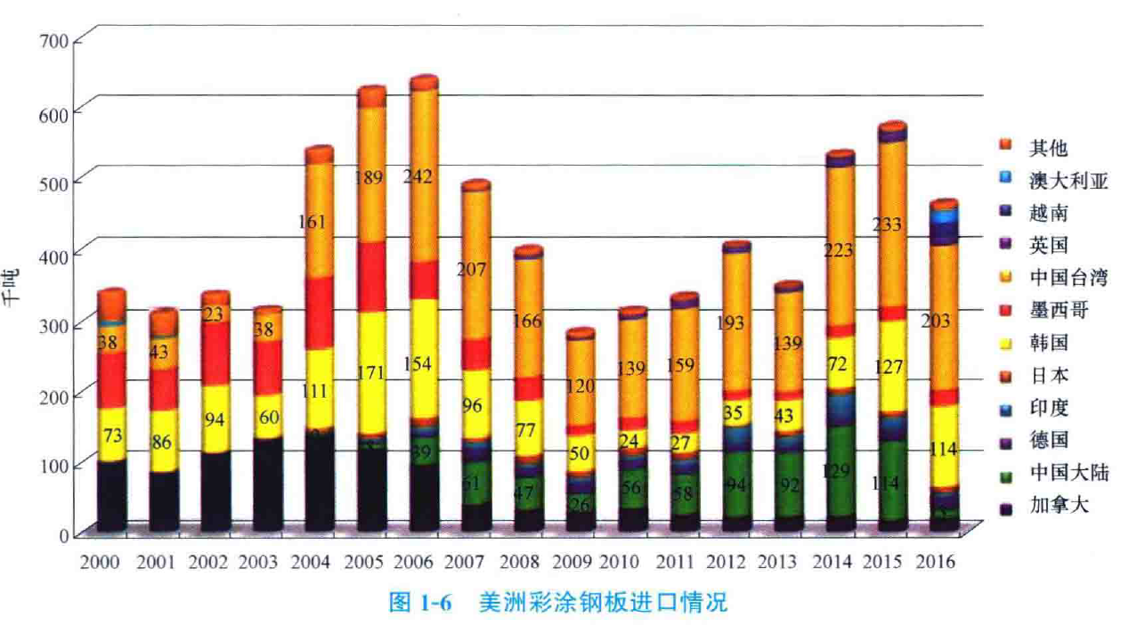 近年來.亞洲彩涂鋼板產(chǎn)顯總體呈上升趨勢。其中國大陸上升趨勢明顯,印度次之。2013 年中國大陸彩涂鋼板產(chǎn)量超過 500 萬噸。由于亞洲產(chǎn)能的迅速增加, 使大量產(chǎn)品流向歐美,影響了全球的彩涂鋼板產(chǎn)品市場,2016 年歐洲進(jìn)口彩涂鋼板約 73 萬噸,主要來自韓國和印度;2016 年美國進(jìn)口彩涂約46萬噸,主要來自中國臺灣和韓國。