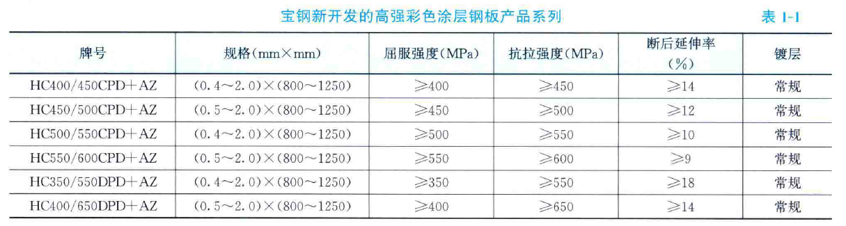 近年來國內外彩色涂層鋼板市場對高強、高韌、具有良好成型性能的彩色涂層鋼板產品需求顯著提高。同時對成本控制要求也不斷增加。針對于此,寶鋼成功開發出具有高強、高韌特性、強度不小于450MPa、斷裂延伸(El)不小于10%的系列先進高強鋼彩色涂層鋼板產品。