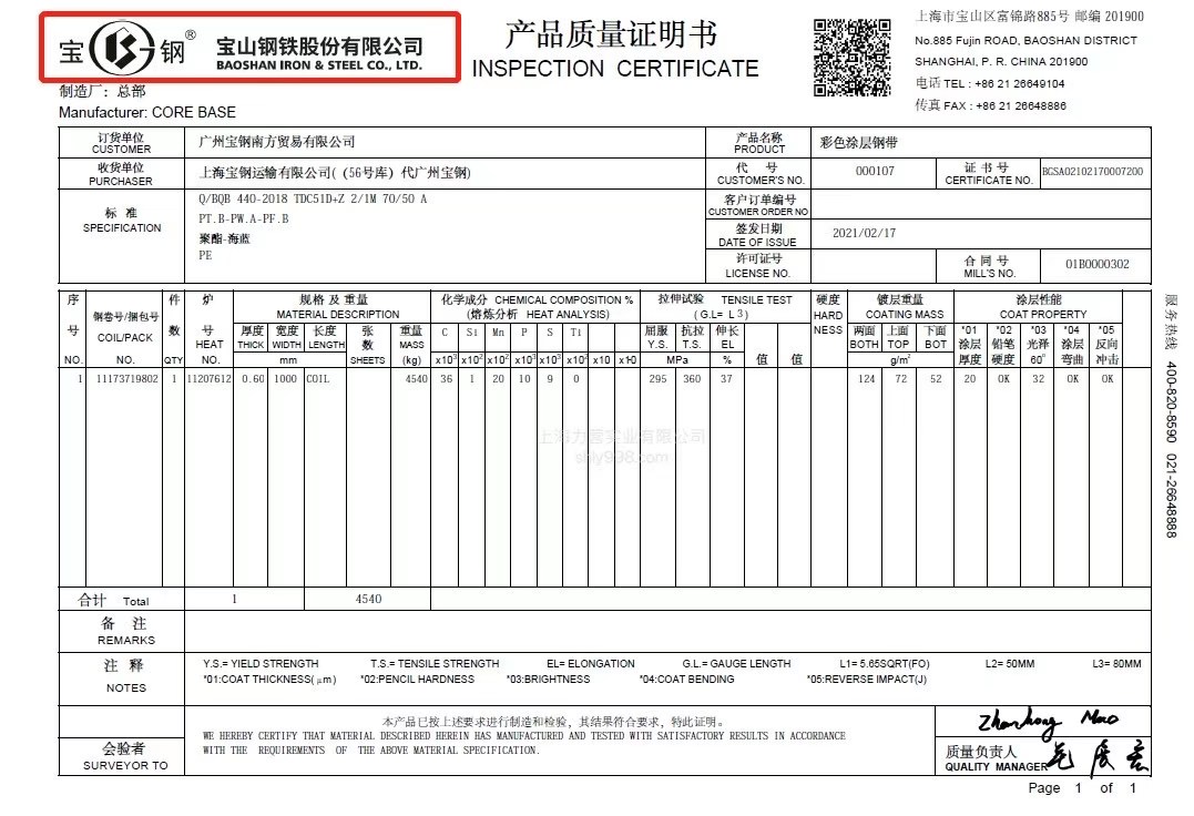 以下三種是上海力營實業郵箱公司隨機抽取的寶鋼彩涂產品的質量證明書,僅供參考,不做其他未經授權的任何商業用途。上海寶鋼