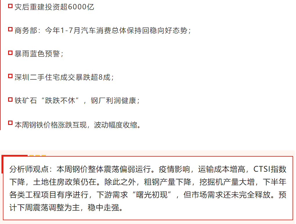 8月13日,河南省政府新聞辦召開“河南省加快災后重建”系列第五場新聞發布會。已統計受災地區損毀項目7283個,涵蓋農田水利、交通設施、市政工程、社會民生、能源、物流等重點領域。河南建立了全省災后重建重大項目庫,目前已謀劃儲備項目8855個,總投資超過6000億元。災后重建工程將會大大拉高市場鋼材需求,中短期利好鋼價。