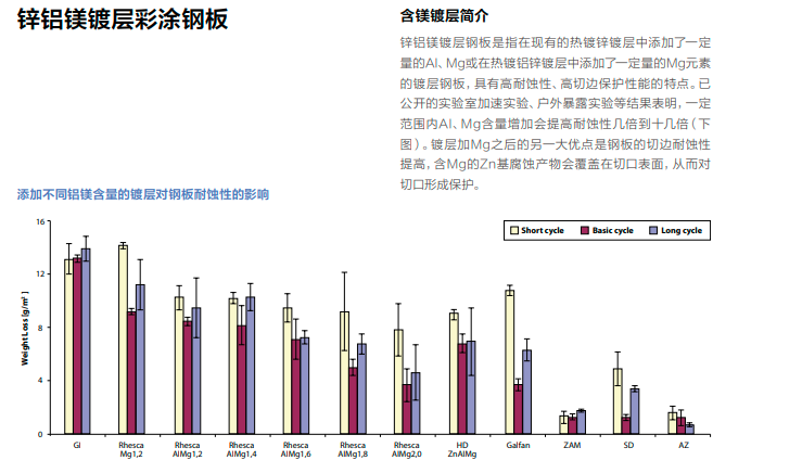 4、中國-寶鋼:BAM,高鋁鋅鋁鎂鍍層,鋁含量:55%,該鍍層是在熱鍍鋁鋅基礎上添加一定的鎂和其他元素形成,寶鋼在2016年8月進行了第一次工業試制。該鍍層鋼板也進行了彩涂機組試驗,并開發成功了高鋁鋅鋁鎂基板彩涂鋼板。該鍍層是熱鍍鋁鋅鍍層耐蝕性的升級版,寶鋼簡稱為BAM鍍層鋼板及其彩涂板。