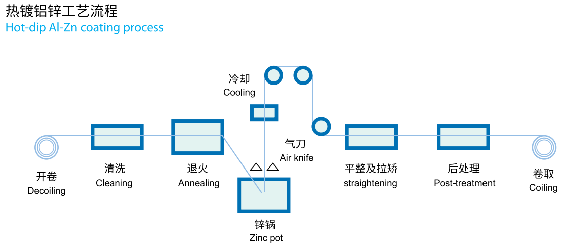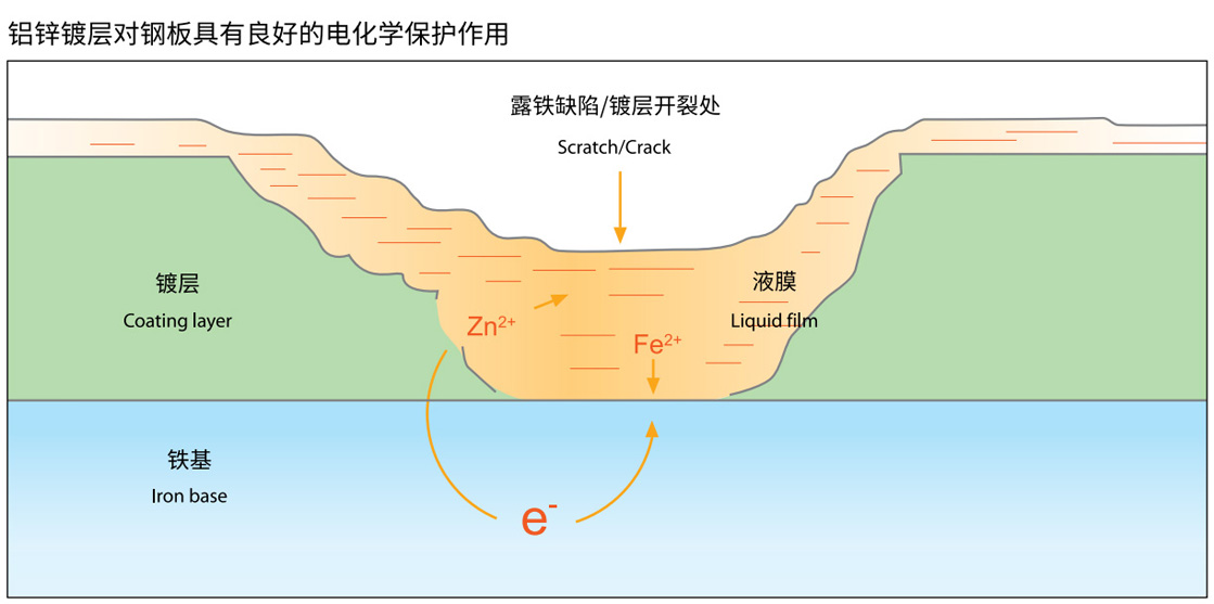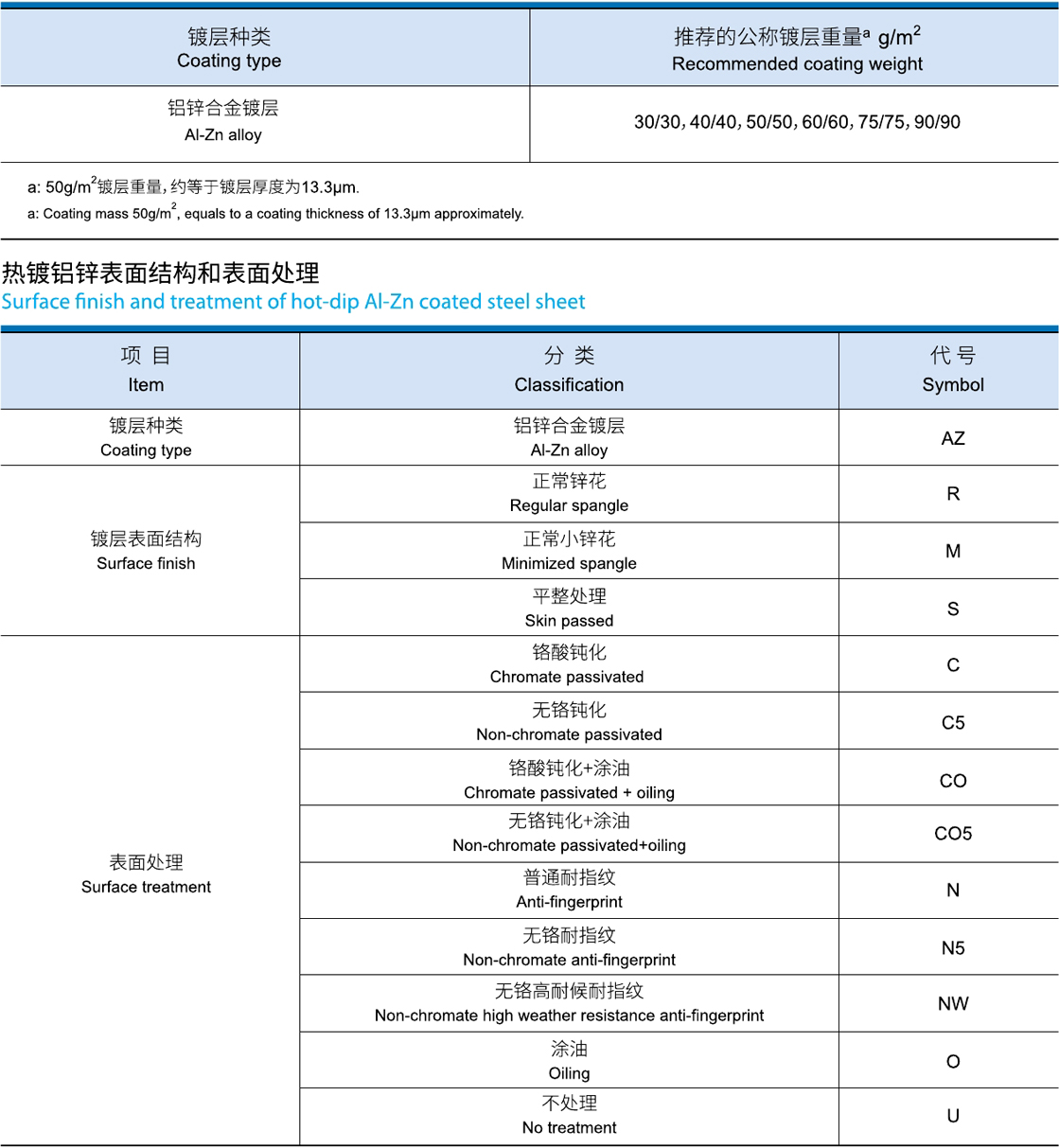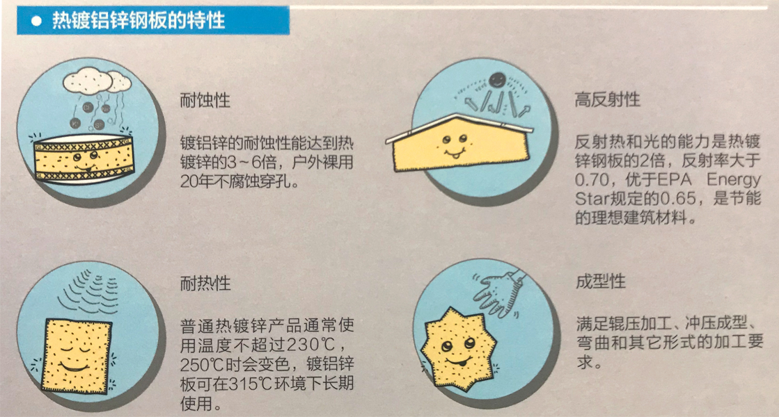熱鍍鋁鋅鋼板是以各種強度和厚度規格的冷軋鋼板為基材,在雙面熱鍍一層Al-Zn鍍層所得到的預鍍層鋼板,鍍層成分中質量百分比約為55%Al、1.6%Si、43.4%Zn。融合了鋁的物理保護和高耐久性以及鋅的電化學保護特性。此外,在表面呈具有高裝飾性的光亮銀灰色澤及規則的花紋,并具有浮凸感。