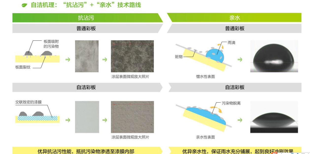 優(yōu)異的抗沾污性能,能抵抗污染物滲透到漆膜內(nèi)。優(yōu)異的親水性能保證了雨水充分展開于涂層表面,起到良好的沖刷效果。