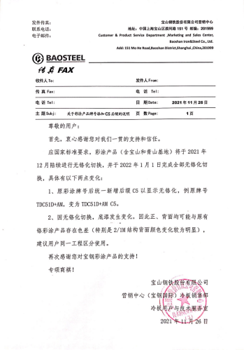 近日,接寶鋼股份營銷中心通知,寶鋼彩涂產品(含寶山和青山基地)將于2021年12月陸續進行無鉻化切換,將于2022年1月1日完成全部無鉻化切換,具體有兩種變化:
